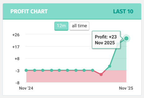 El servicio está activo desde agosto de 2025. Desde entonces he publicado 100 picks con los que hemos obtenido 23 unidades. Un suscriptor que haya utilizado 10€ como valor de la unidad habrá ganado 230€. Como su bank es de 300€, la rentabilidad bruta es superior al 75% en este periodo.